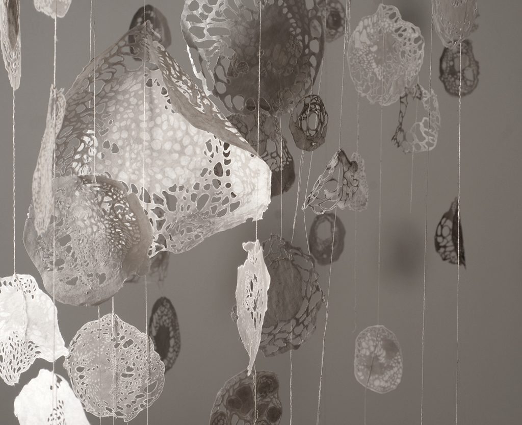 A well-meaning organicity springs out of the Kozo Japanese paper which texture evacuates all notion of technicality. The vertical arrangement of strings holding the cells up in the air, here and there, evoke either snow flakes in their shades of white and grey, or Christmas balls juxtaposing a multitude of round and open apertures of different formats.
